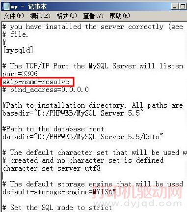 2、禁用IP反向解析域名,修改配置文件,MySQL的配置文件My.ini (在MYSQL的安装目录)。